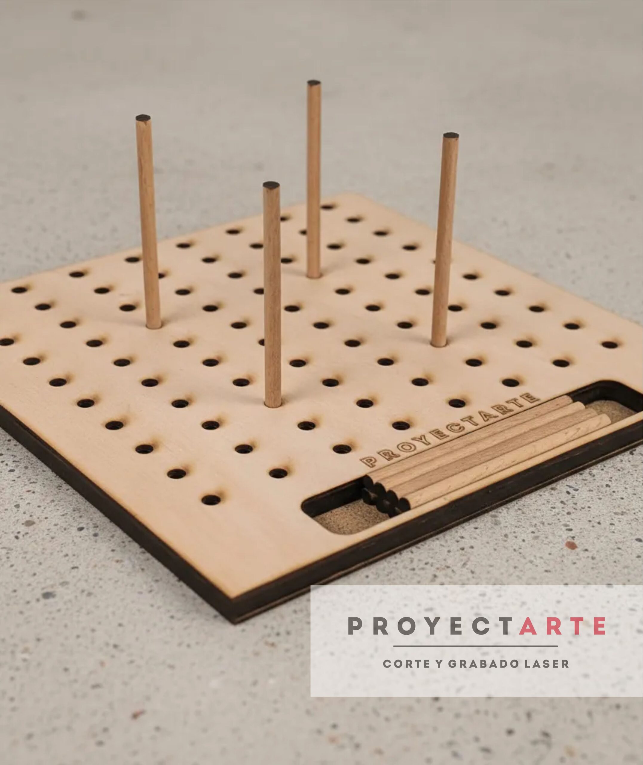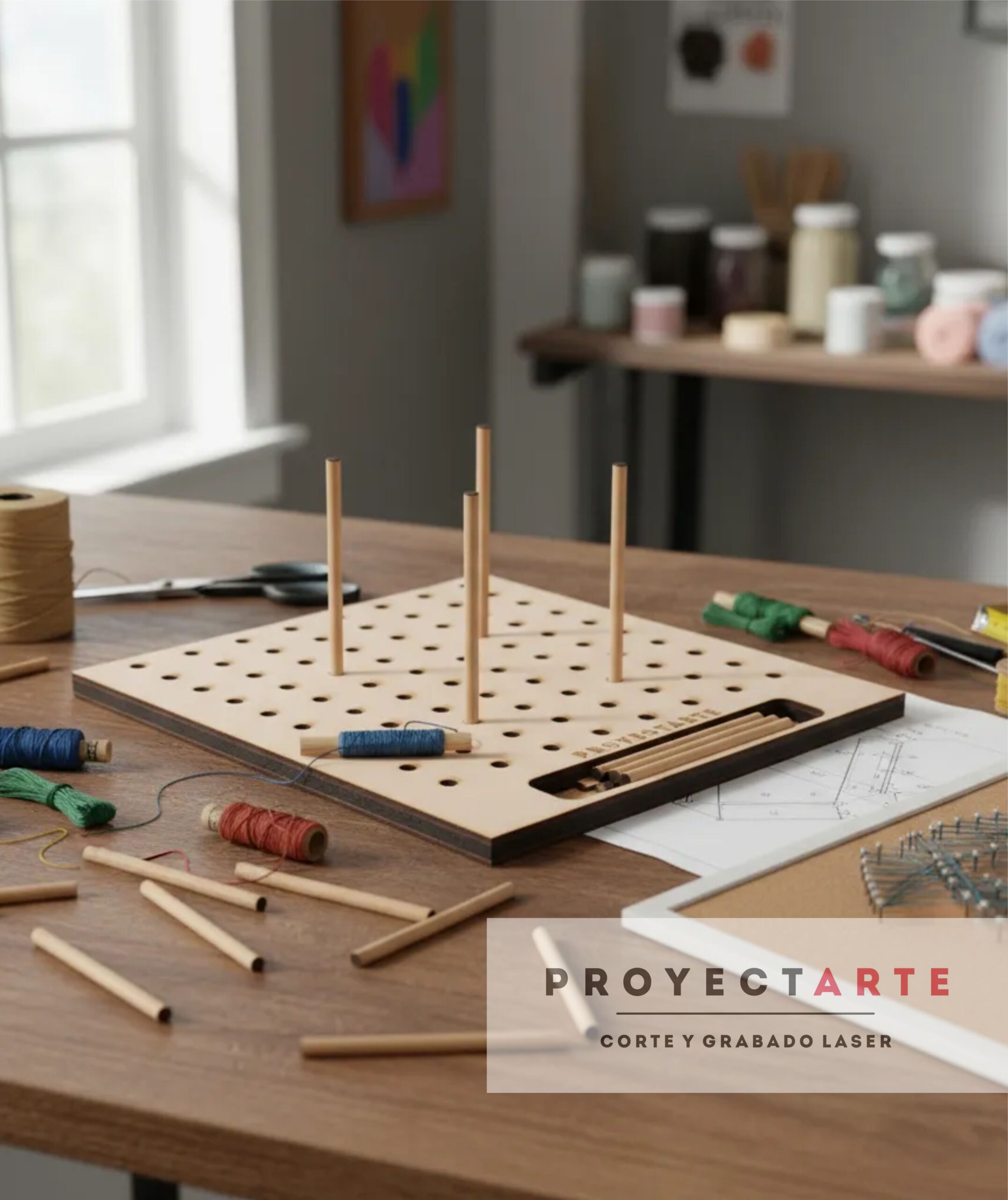 Base para crochet de 25cm x 25cm que incluye 12 pins de 10 cm de alto cada uno.