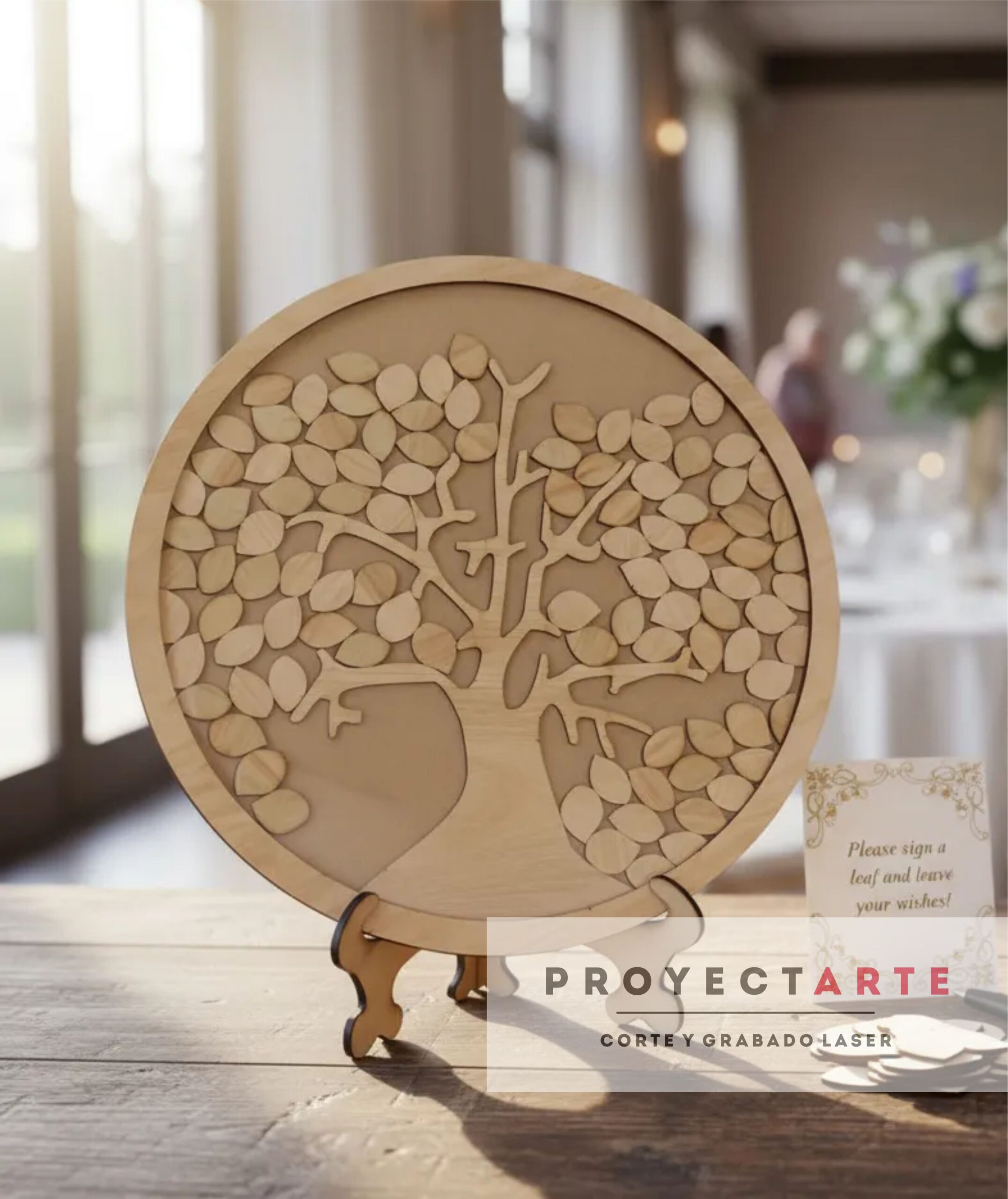 Cuadro para firmas modelo árbol de la vida. Medidas 40cm de diámetro. Árbol y frente de fibra de madera. Incluye soporte para apoyar en la mesa. Incluye 100 hojitas de aproximadamente 3cm. El árbol en este modelo va dentro del acrílico pegado al fondo.
