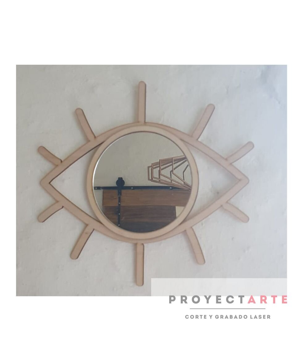 Espejo ojo realizado en fibra de madera con detalles de veta natural y espejo sintético que evita roturas y daños.