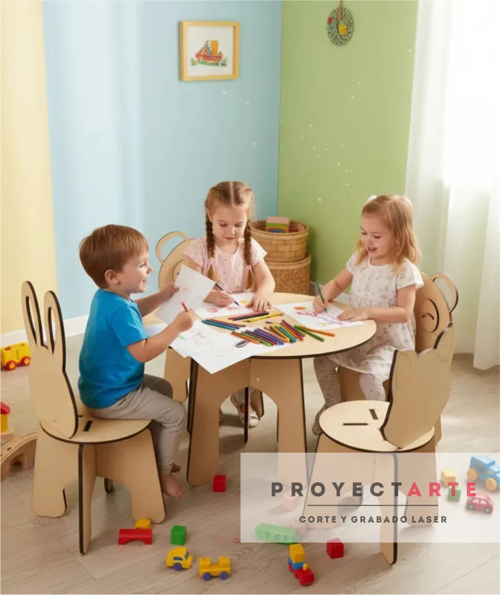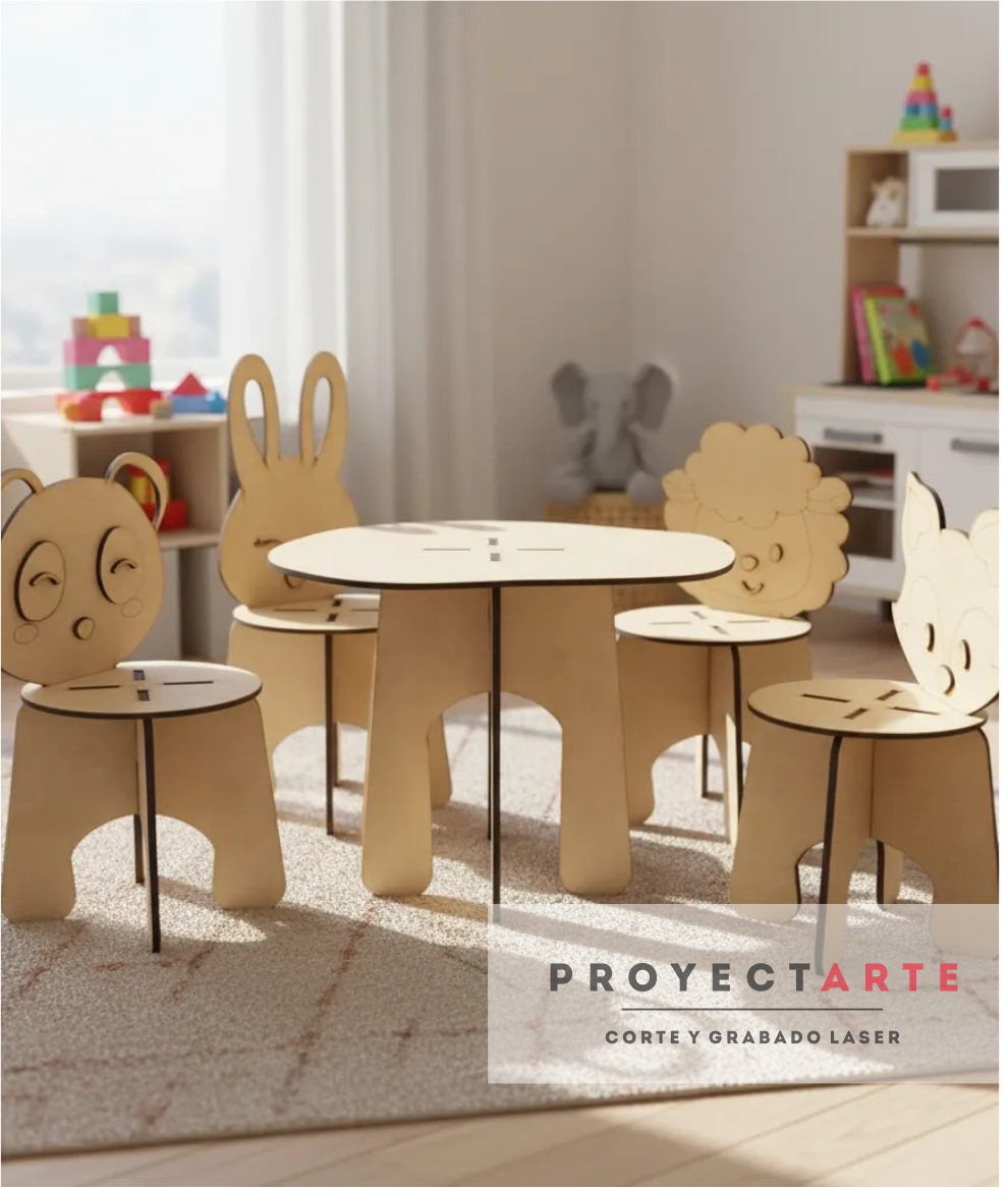 Completo: banquitos animales infantiles y mesa forma tronco. Bases en 9mm y respaldos y asientos en 5.5 mm.
