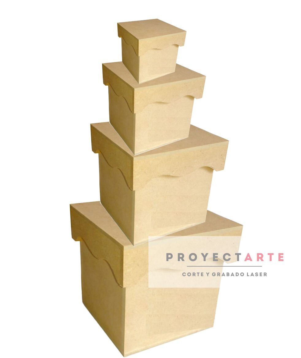 4 cajas realizadas en mdf de 5,5mm modelo capuchón. Medidas: extra grande 25x25x25cm, grande 20x20x20cm, mediana 15x15x15cm y chica 10x10x10cm. Se guardan una dentro de otra.
