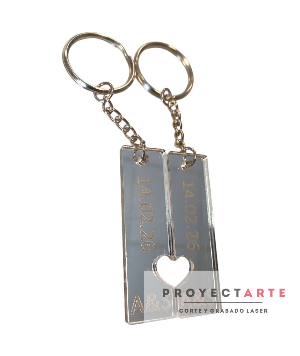 Llavero doble para compartir realizado en acrílico espejado con iniciales y fecha grabadas.