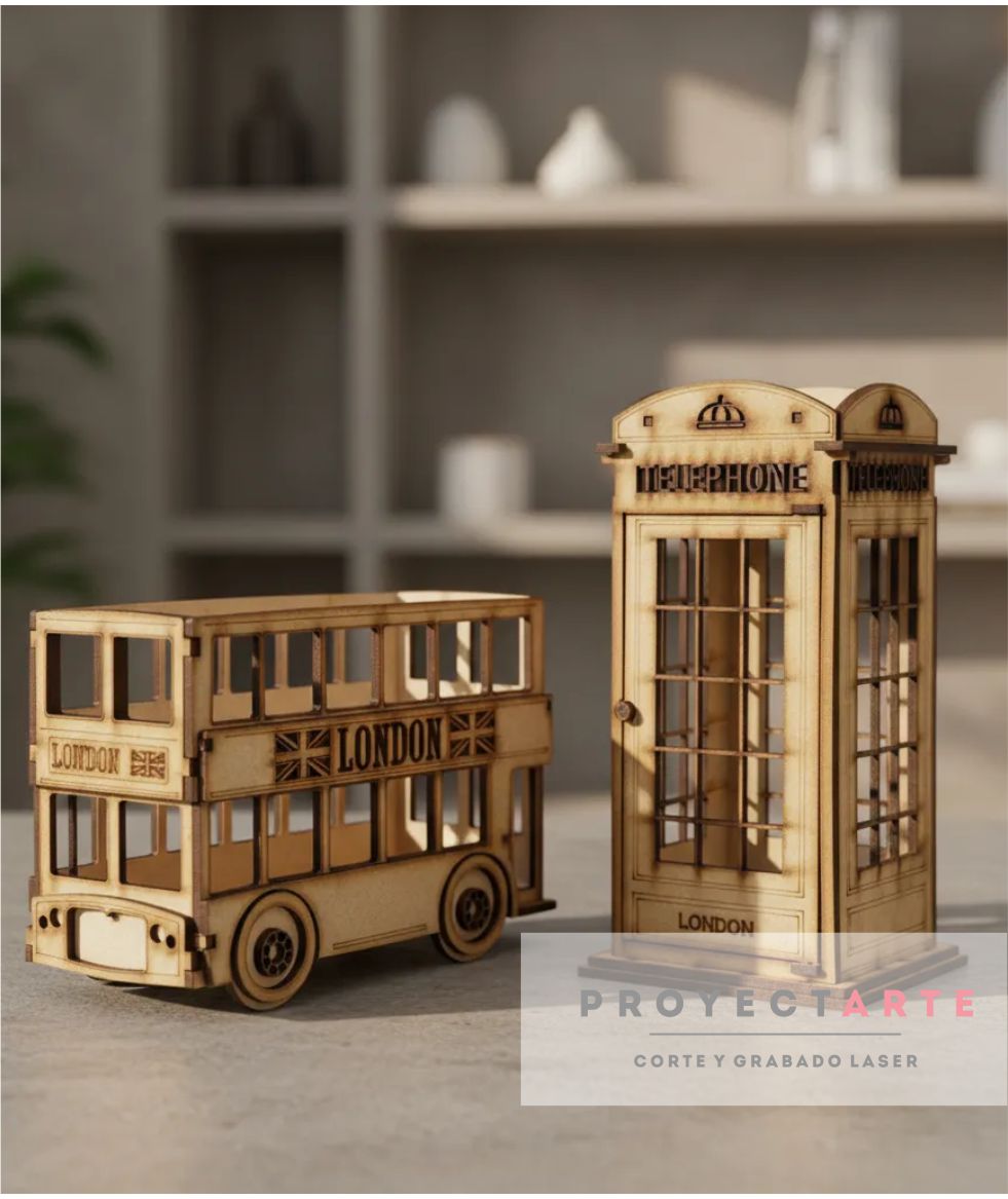Omnibus realizado en mdf 3mm. Mide 18 x 8 x 13 cm Cabina realizada en mdf de 3mm Mide 10 x 10 x 21 cm Presentados en caja para armar.