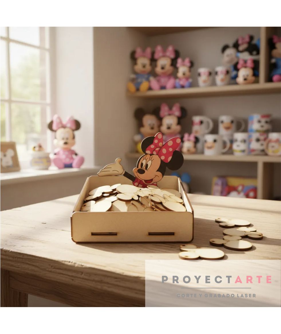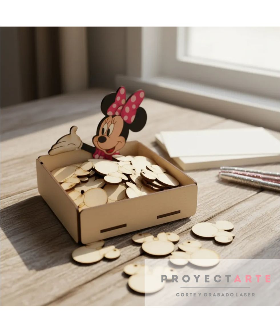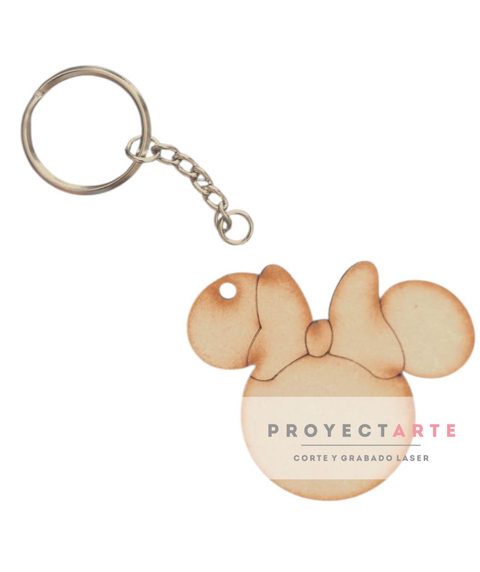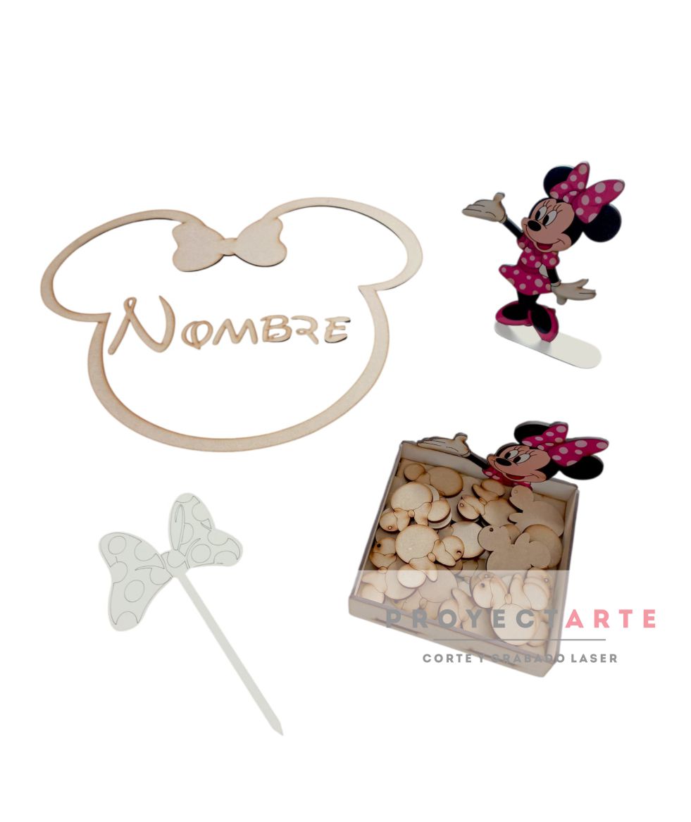 Pack de cumpleaños que incluye: aro con nombre realizado en mdf de 3mm, 25 llaveros con nombre marcado realizados en mdf de 3mm, 25 aros y cadenitas, topper para torta realizado en mdf laminado blanco, cajita para llaveros y minnie con base.