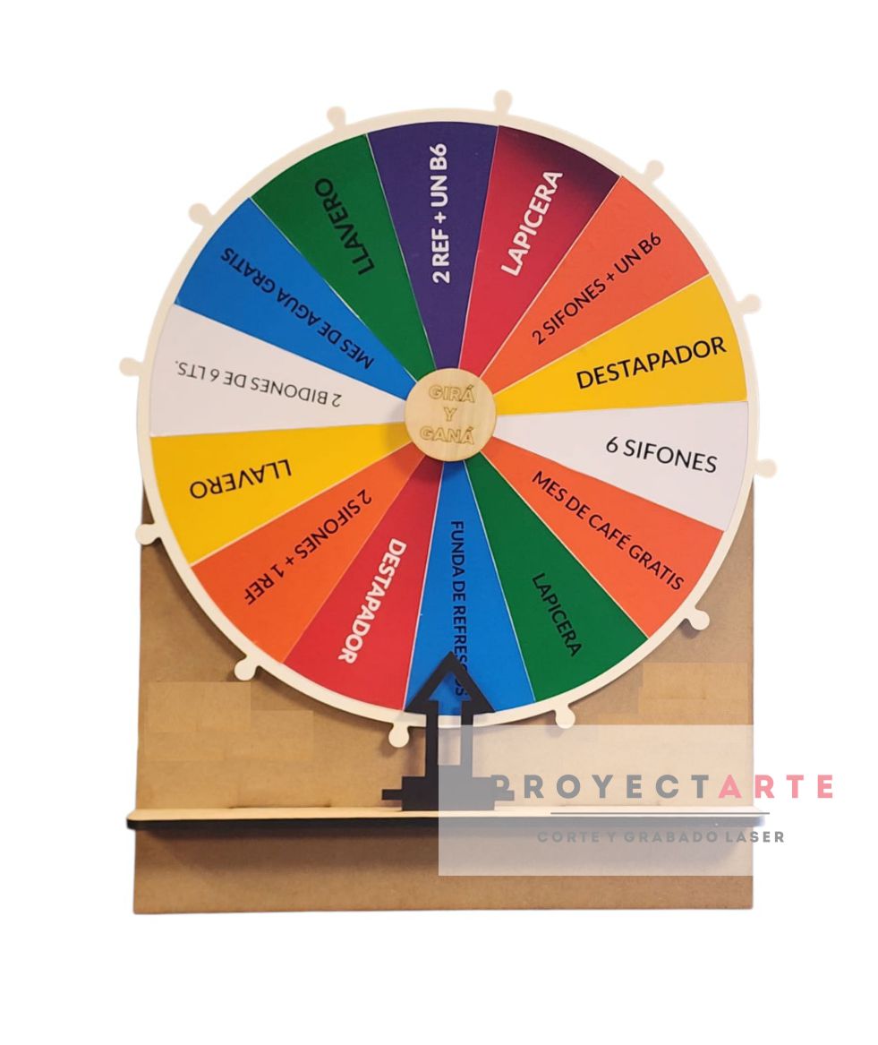 Ruleta, rueda giratoria de 60cm en fibra de madera. Soporte de 72.5cm x 56cm en mdf de 5.5mm Flecha de 15cm x 12cm en mdf laminado negro
